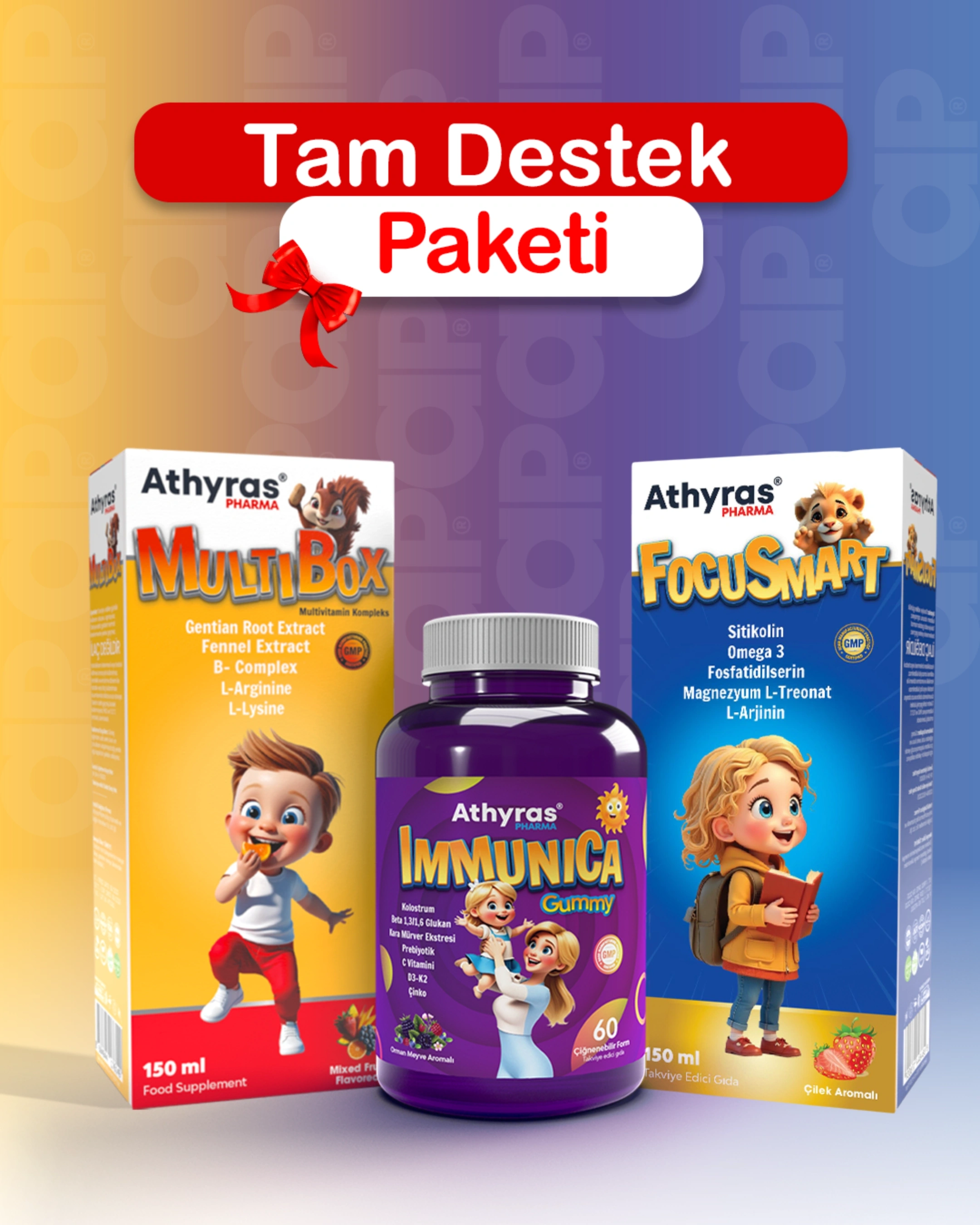 Bu paket; FocuSmart, Immunica Gummy ve MultiBox ürünlerini bir araya getirerek çocukların günlük rutinine çok yönlü bir yaklaşım sunmak üzere hazırlanmıştır.